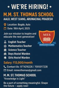 📢 Job Opportunities at M.M. St. Thomas School, Aalo (West Siang, Arunachal Pradesh)