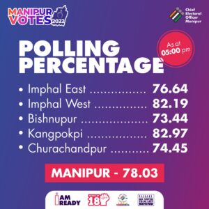 The polling percentage as per reports available till 5 pm are recorded at 78.03 per cent. Imphal East reported 76.64 per cent voter turnout while Imphal West recorded 82.19 per cent. Bishnupur recorded 73.44o per cent, Churachandpur 74.45 per cent while Kangpokpi recorded 82.19 per cent.